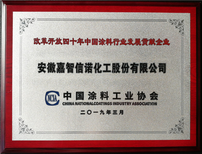 熱烈祝賀安徽嘉智信諾化工股份有限公司被中國(guó)涂料工業(yè)協(xié)會(huì)授予“改革開(kāi)放四十年中國(guó)涂料行業(yè)發(fā)展貢獻(xiàn)企業(yè)”稱(chēng)號(hào);