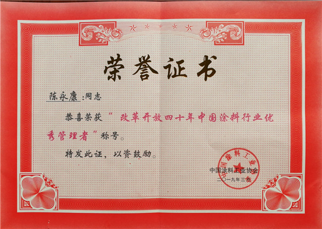 熱烈祝賀陳永康先生被中國(guó)涂料工業(yè)協(xié)會(huì)授予“改革開(kāi)放四十年中國(guó)涂料行業(yè)優(yōu)秀管理者”稱(chēng)號(hào)。