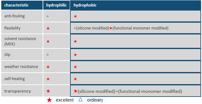 The initial product flexibility of hydrophobic paint protective film coating is slightly weak, and the flexibility of the product modified by special monomer can achieve the better effect of hydrophilic type, and its anti-fouling performance is better than that of hydrophilic type, with excellent weather resistance. It can be selected according to the actual requirements.